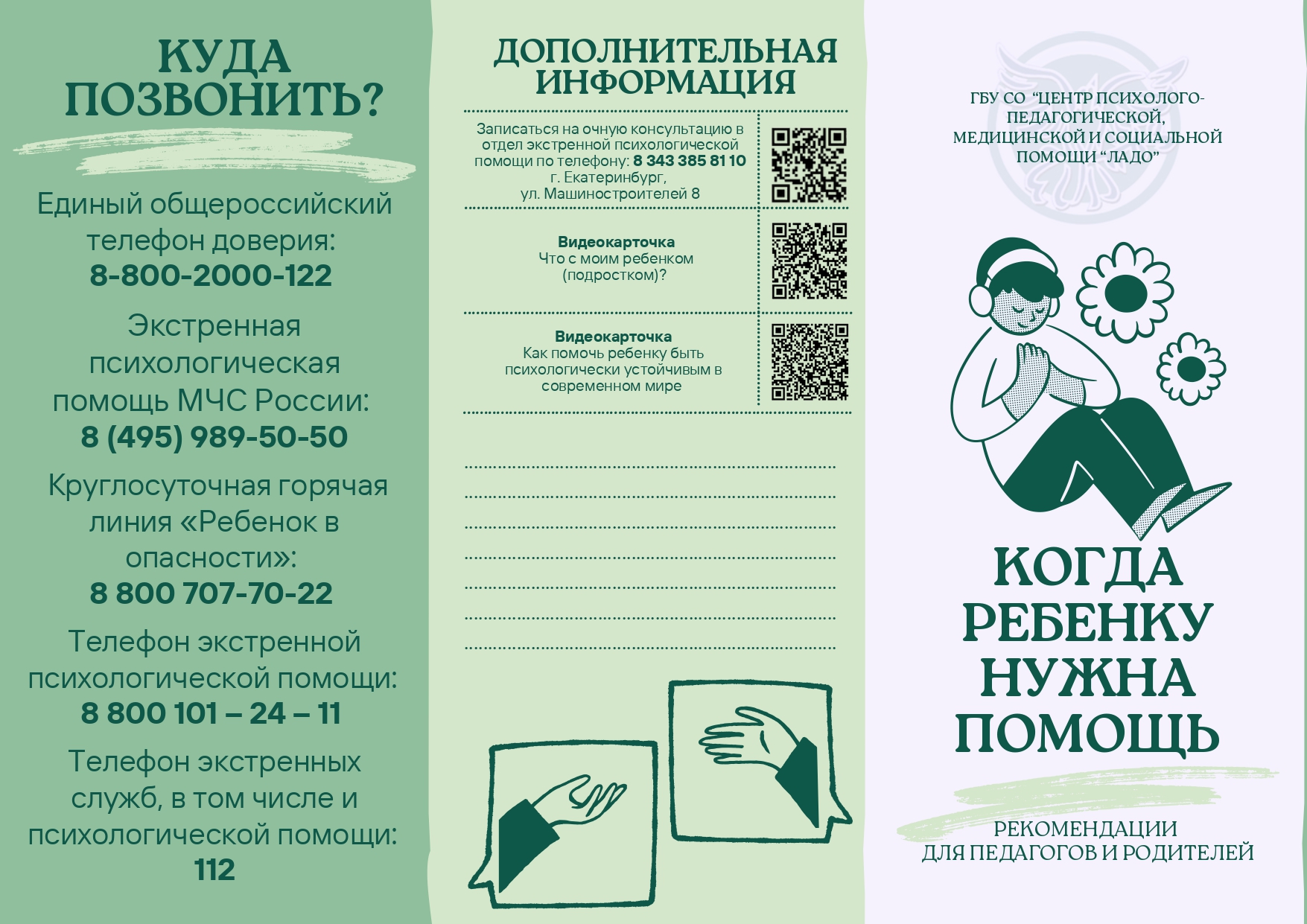 88001012411 - телефон экстренной психологической помощи ГБУ СО "ЦППСМСП "Ладо"